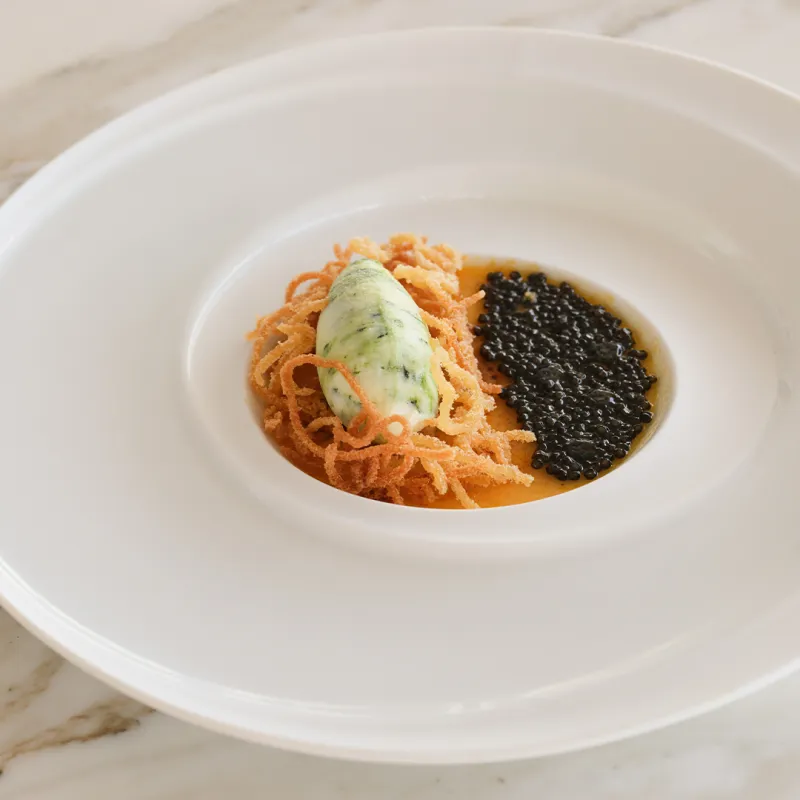 “Je viens d'Argentine, et là-bas, le dulce de leche est comme le Nutella en France. On peut le tartiner sur du pain le matin, on le trouve dans toutes les pâtisseries… Ça rappelle l'enfance, c'est hyper réconfortant. Le caviar est un produit d'exception réservé à de grandes occasions, c'est l'élément festif de ce dessert. Il va donner un côté iodé hyper intense, qui sera équilibré par le côté sucré du caramel. Le plancton est une micro-algue dont les baleines se nourrissent. C'est un aliment excellent pour la santé car il est riche en minéraux et vitamines. Le Maybourne Riviera, l'hôtel où je travaille, nous a installé une télévision dans la cantine du staff, pour qu'on puisse suivre la compétition. J'ai une sous-cheffe fan des Jeux olympiques, elle y assistera avec sa famille. Elle nous a fait rentrer dans son monde en partageant sa passion, et elle était très enthousiaste à l'idée de proposer un dessert pour fêter une victoire. Pour ma part, lorsque j'étais petite, je suivais beaucoup le hockey, la natation et le basket. S'il y avait un affrontement France-Argentine, je ne saurais pas qui supporter, le choix serait trop compliqué !”