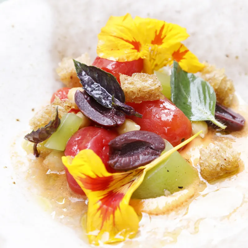 “Cette recette est née d’une conversation avec Brice Guyart, double médaillé d’or de fleuret par équipe aux JO de Sydney en 2000 et d’Athènes en 2004, et membre du Comité d’organisation des Jeux de Paris 2024. Lorsque je m’entrainais, Brice était un héros pour moi. Un jour, il m’a parlé de la salade grecque mémorable qu’il mangeait sur le Village Olympique d’Athènes, si rafraîchissante avec ses tomates au goût incroyable. Pour l’adapter au régime sportif et en faire une recette à la fois équilibrée et nourrissante, j’ai imaginé une version en forme de salade-soupe, avec la consistance d’une salade et le côté désaltérant d’une soupe d’été. Pour la rendre plus digeste, j’ai enlevé les oignons rouges et les poivrons crus, ajouté du pain toasté pour les féculents et des pois chiches pour la mâche et les protéines végétales. Les tomates, elles, vont apporter de la jutosité, de la fraîcheur, et de l’acidité. Cette recette est inspirée d’une recette italienne : la panzanella qui permet d’utiliser les restes de pain de la veille pour l’imbiber avec le jus d’une tomate et le réhydrater. Fin juillet, en pleine saison de la tomate, cette salade serait, pour moi, le repas parfait à déguster sur le Village Olympique.”